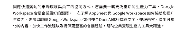 google workspace | 職場能力進化術! 報名了解如何運用 Google Workspace 的 AppSheet 與 Duet AI 自動草擬 Gmail 信件、整理和分析試算表、快速產生簡報並提供更豐富的線上會議體驗 ! | 線上研討會 | 2023