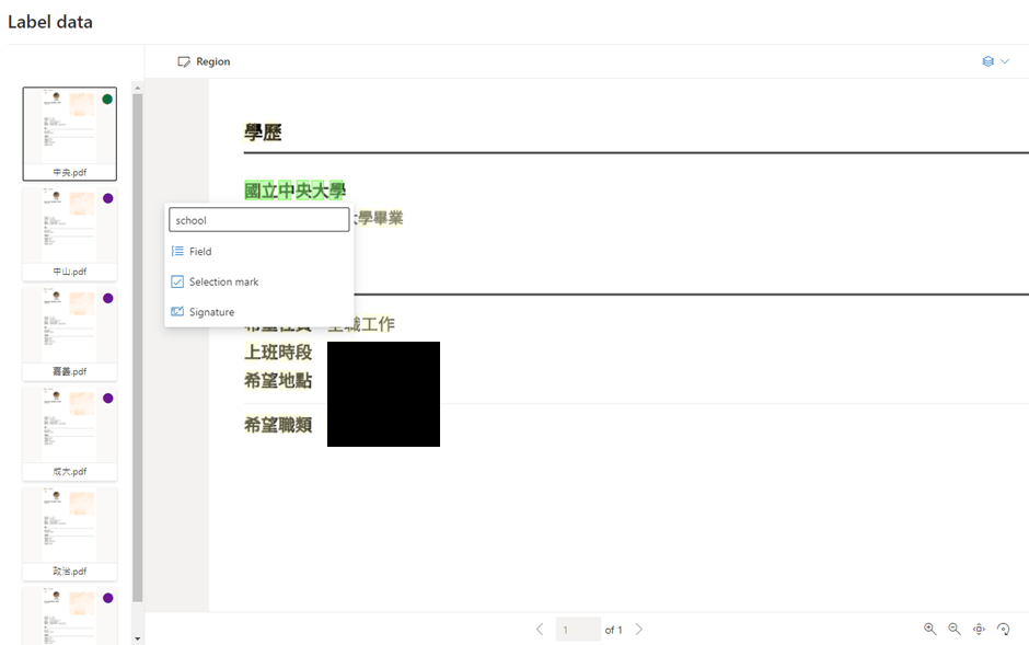 Microsoft Azure Form Recognizer 幫你分析紙本表單 | 資料標籤與模型訓練-標籤所要擷取的文字範圍:被圈選的文字會反綠並彈出輸入框,我們將命名欄位填寫為 school,之後再選擇 Field 便會將這個位置的國立中央大學標記為 school。